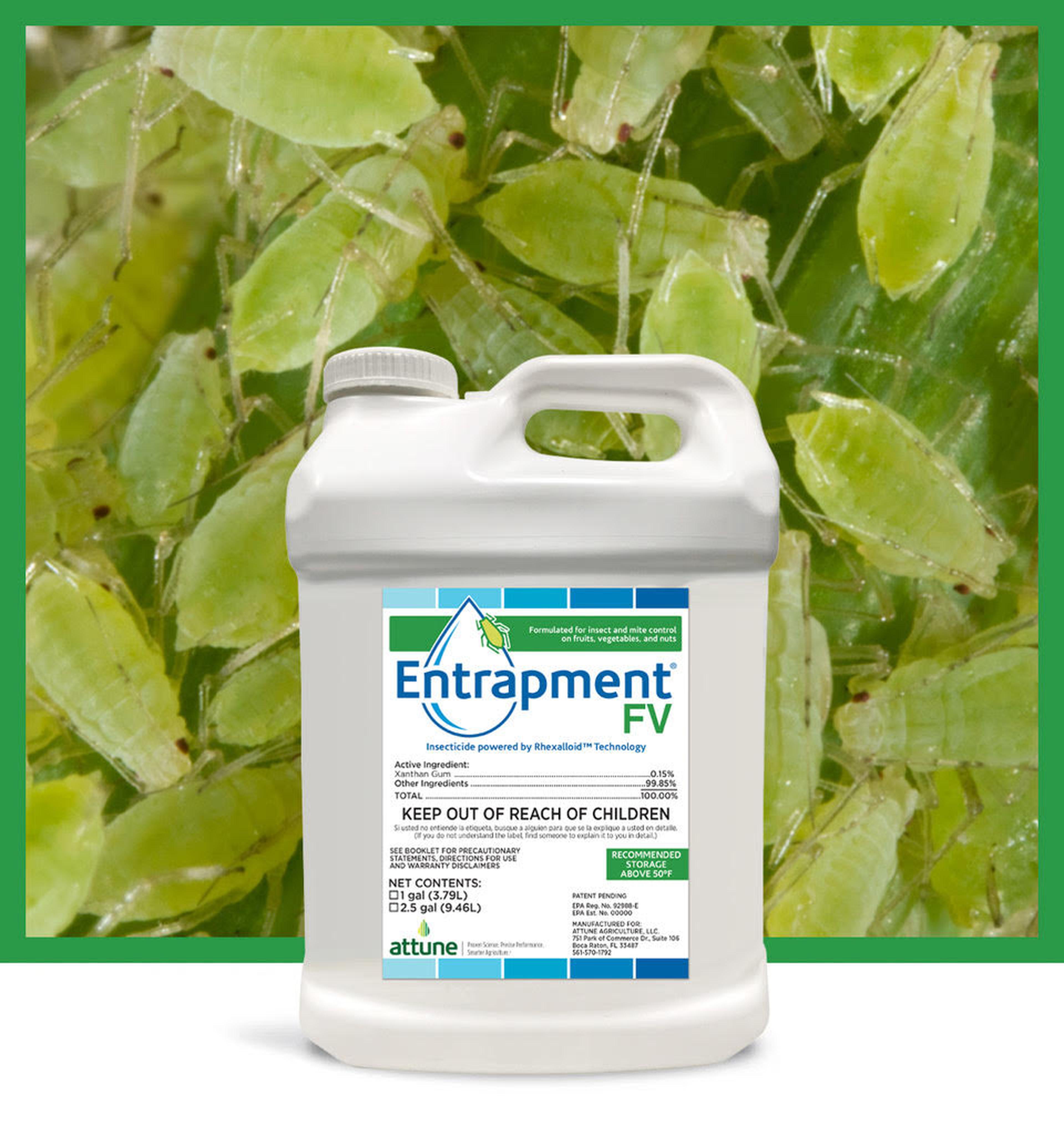 Entrapment® is a non-systemic, contact insecticide that utilizes a physical mode of action to control insect pests. Powered by Rhexalloid® technology, Entrapment harnesses the power of hydrocolloids to transform every water droplet in your tank mix into adhesive traps on the target for insect and mite pests with performance equal to, or greater than, conventional chemical insecticides.
