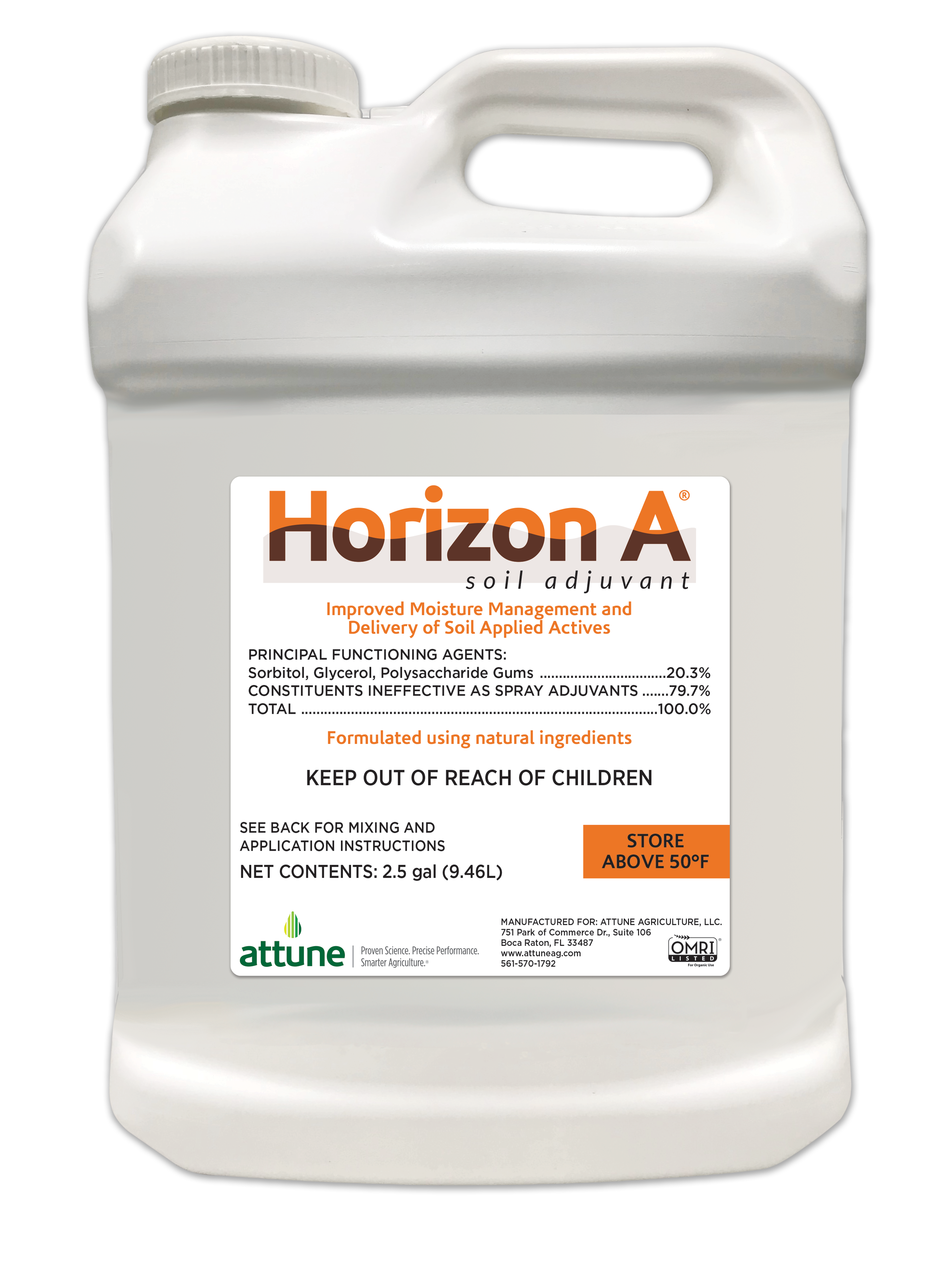 Holding actives and water in the root zone allows plants to absorb more of what is applied. Horizon A improves the effectiveness and persistence of soil-applied herbicides, insecticides, fungicides, nematicides, nutrients, and fertilizers under variable soil and environmental conditions.